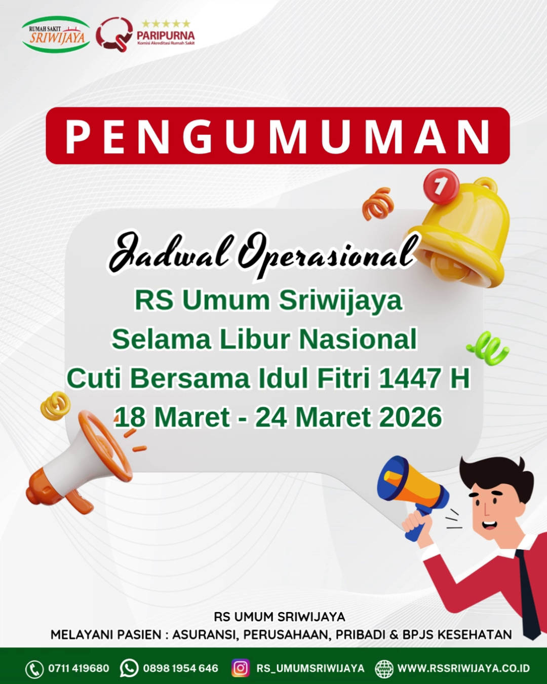 RS Umum Sriwijaya Melayani Pasien BPJS, Umum, Perusahaan & Asuransi.